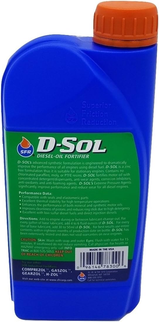D-Sol's Leading technology, relies on a new patented technology using both extreme pressure and anti-wear agents. SFR's synthetic fortifiers contain organo-tungsten with special alkylated diphenylamines for deposit control at elevated temperatures, which improves oxidation stability and drain intervals. D-Sol has a very low friction coefficient to reduce wear significantly over regular motor oil. Diesel engines, with the creation of soot, need additional detergents than what is required for a gasoline engine. For this reason D-Sol has more detergents than Gaszol to fight soot deposit accumulation. Testing has revealed that tungsten has excellent anti-wear properties over molybdenum (moly) and being a transition metal actually bonds with iron to form a smoother surface. For the ultimate in wear reduction use D-SOL in your diesel engine with each oil change. D-SOL was engineered for today’s indirect and direct drive diesel engines. It is compatible with the new CJ-4 diesel specification as it contains no sulfur or phosphorus thus it is safe for new diesel emission systems. Due to the soot build up of a diesel over a gasoline engine, D-SOL contains special detergent additives to keep engines clean. With its unique synthetic formula it will extend drain intervals and provide superior protection under extreme temperatures. SFR is the leading company to engineer an oil fortifier just for diesel engines. Testing through oil analysis has shown an extensive reduction in wear using D-SOL. Outstanding for equipment not used constantly such as older farm tractors, RV’s, etc. because the extreme pressure agents remain on the oil at all times regardless of use. This reduces wear during start up and operation.